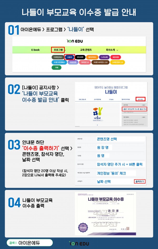 나들이 나들이 부모교육 이수증 발급 안내 페이지 정보 작성자 관리자 댓글 0건 조회 328회 본문 안녕하세요.나들이 부모교육 이수증 발급 관련 안내드립니다.이수증 출력은 회원가입 시 ‘원장님’으로 가입하신 경우에만 가능합니다.이수증 출력이 필요하신 원장님께서는 ‘원장님’으로 회원가입을 진행해 주시기 바랍니다.감사합니다. 검색 목록 다음글2월 25일 나들이 교사교육 수료증 안내 25.02.25 댓글목록 댓글 등록 시, 로그인이 필요합니다. 로그인 댓글목록 등록된 댓글이 없습니다.